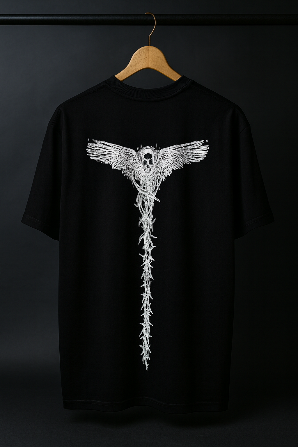 The Deathwing Seraph Oversized T-Shirt is designed for those who embrace dark art, bold expression, and premium comfort. The front remains plain black, keeping the look minimal and versatile, while the back showcases an intricate white winged-skeleton illustration — a dramatic fusion of wings, bones, and spine that gives the tee a strong, otherworldly presence.