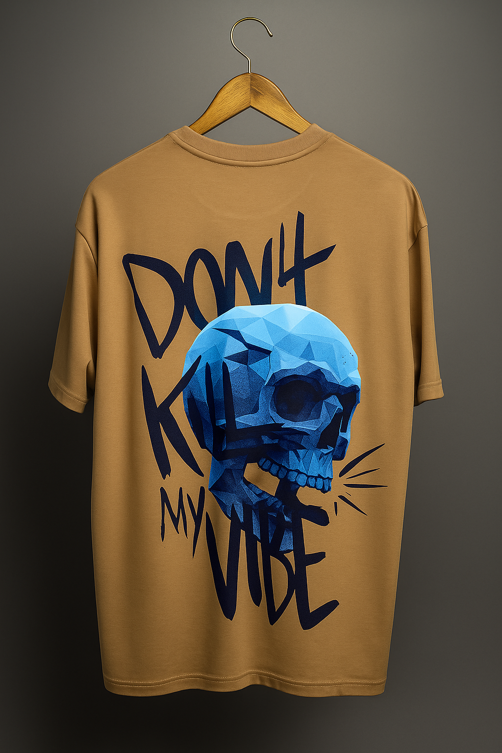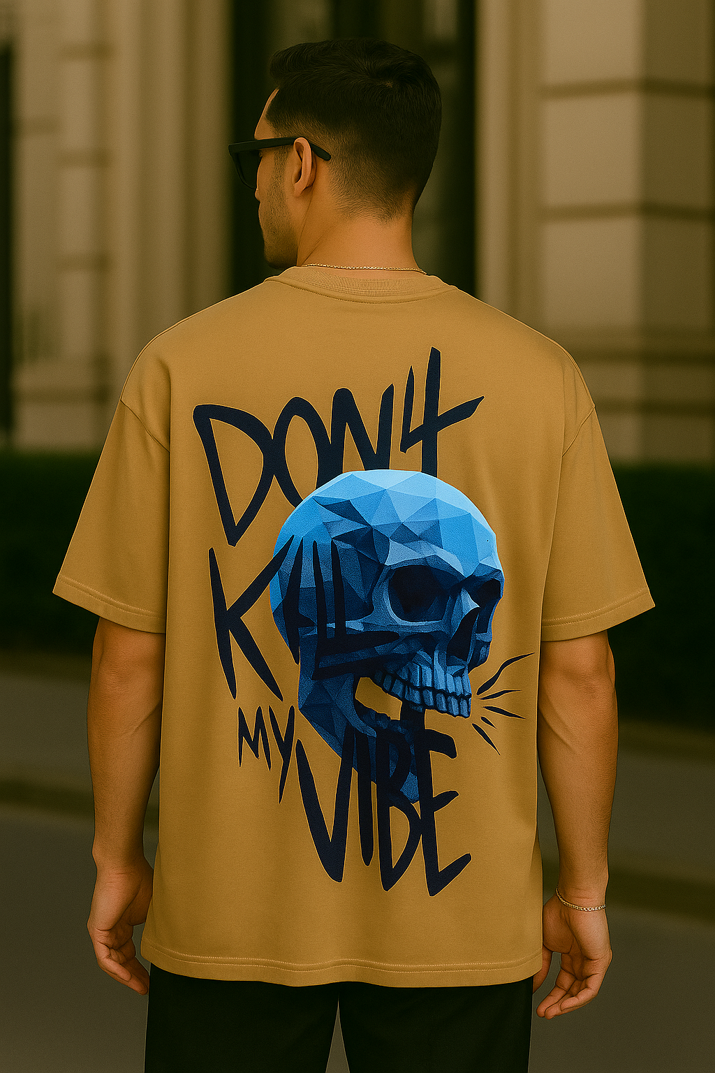 Stand out with confidence in the “Don’t Kill My Vibe” Oversized T-Shirt, designed for those who bring their own energy wherever they go. The back features a bold and artistic blue 3D skull graphic paired with powerful text that makes a fearless style statement.